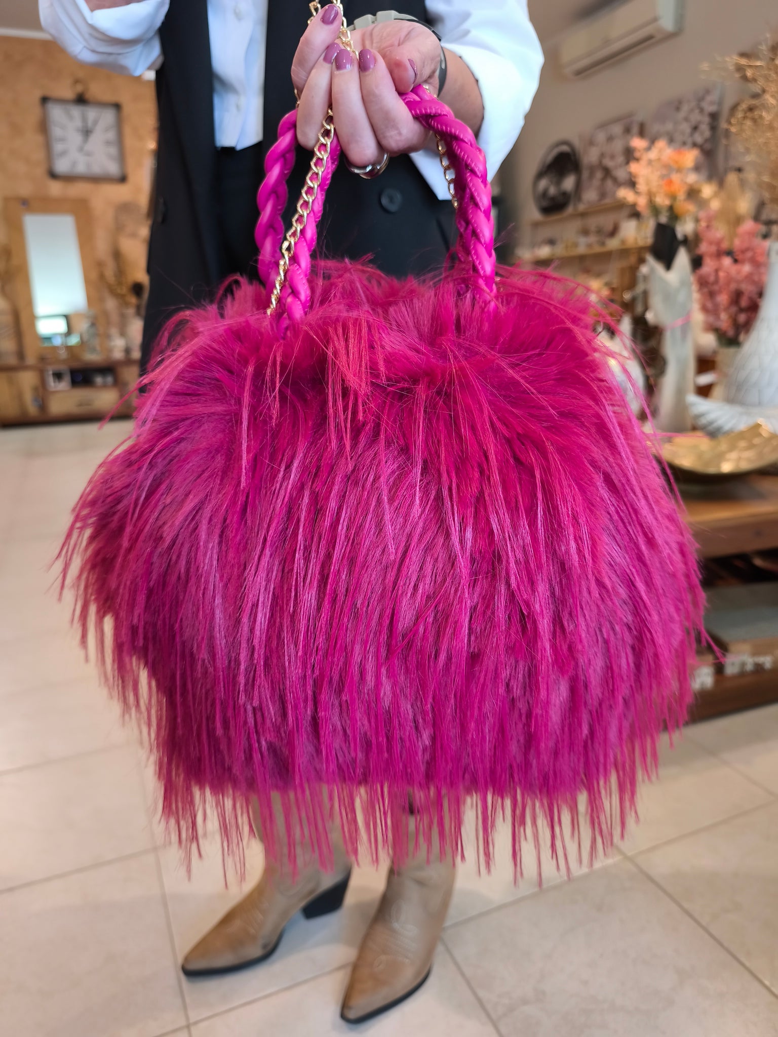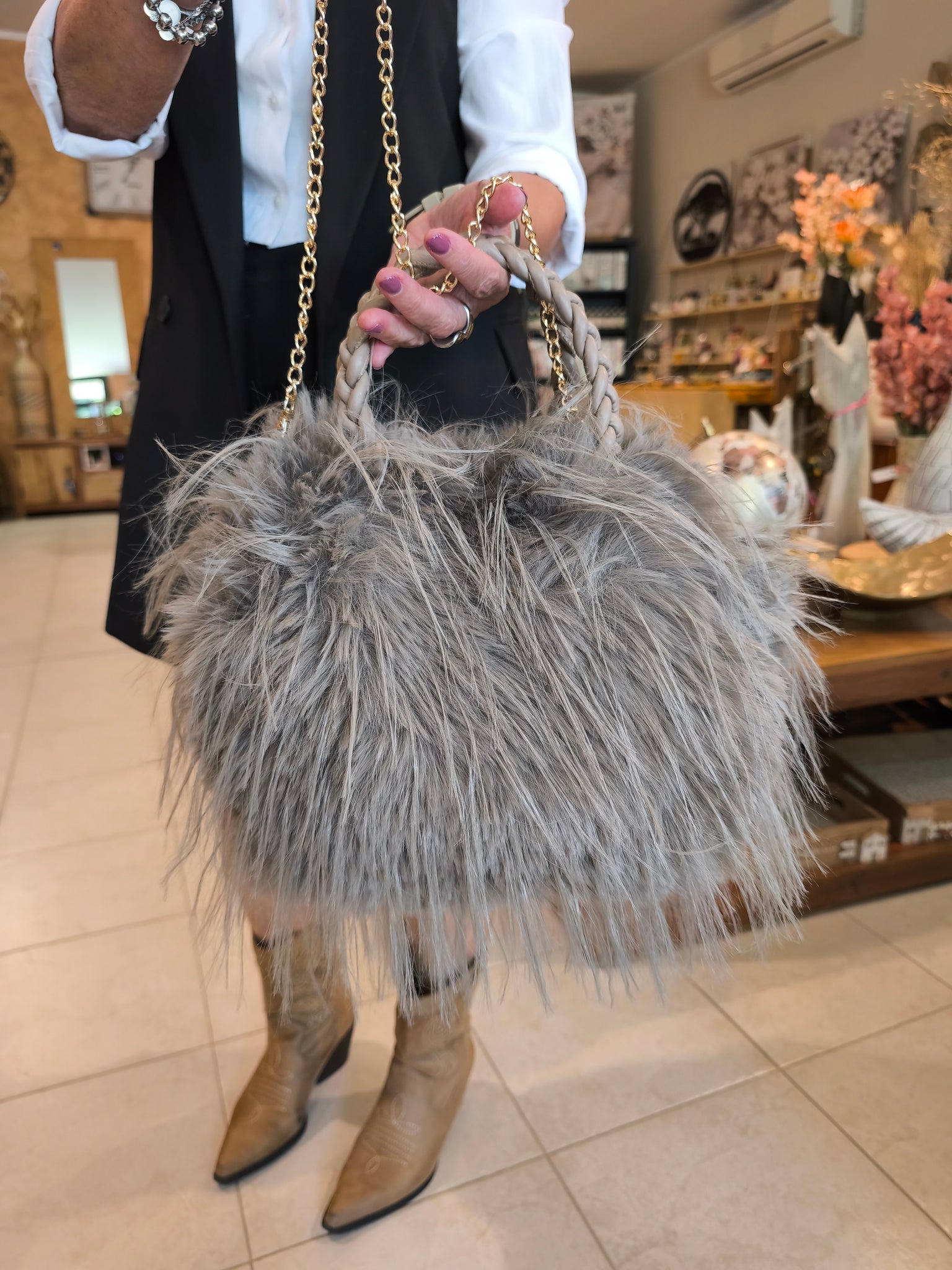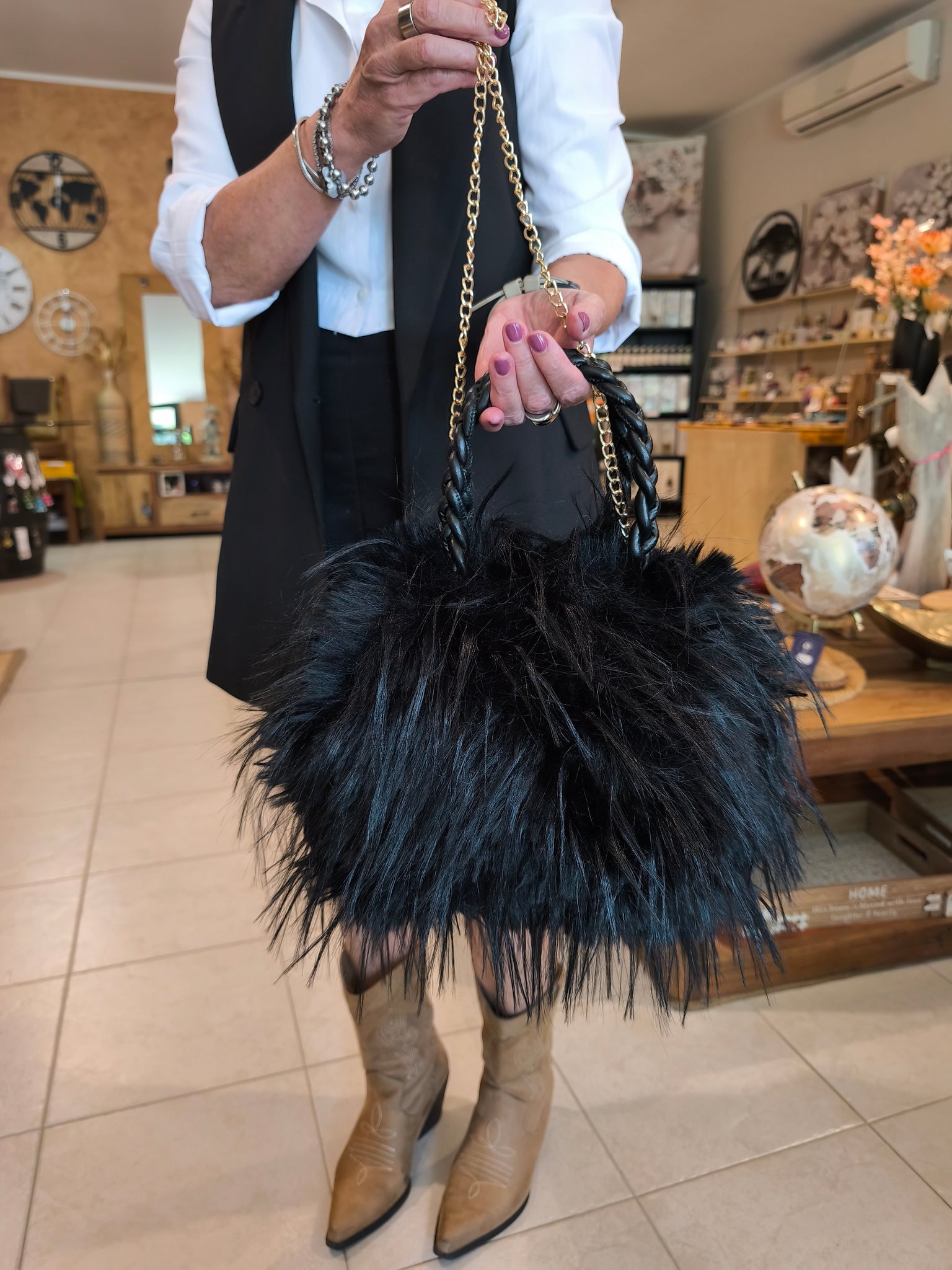 Borsa in pelliccia ecologica effetto spettinato con 2 manici intrecciati in ecopelle, più tracolla in catena dorata. La chiusura è con bottone a pressione.