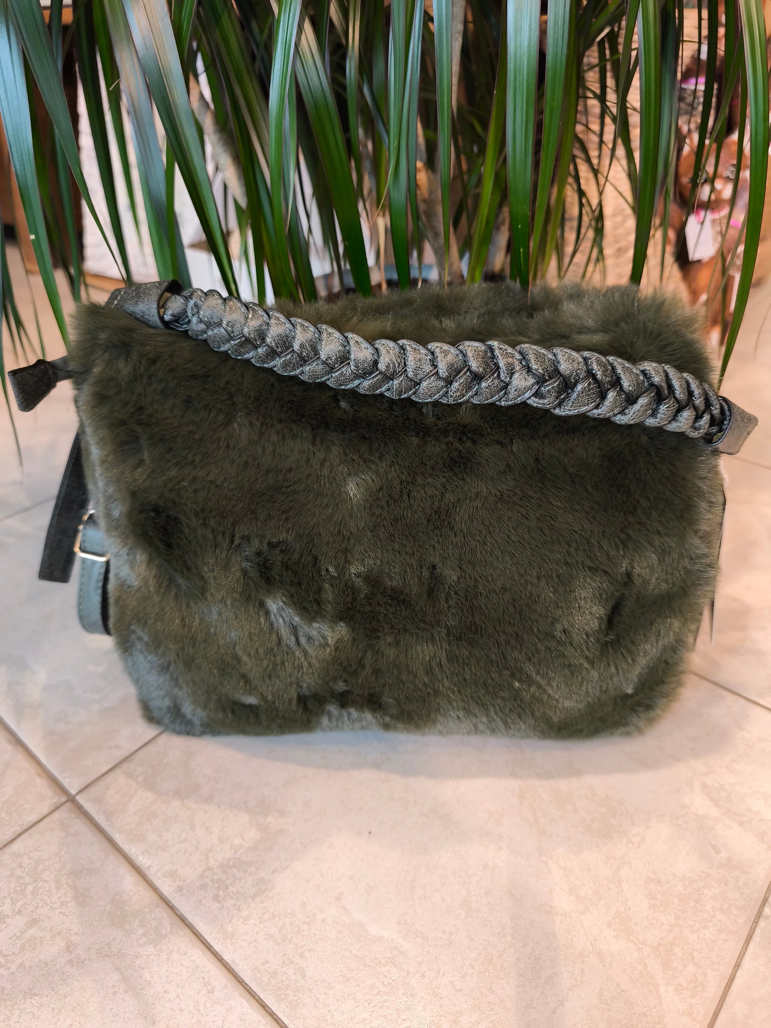 Borsa in pelliccia ecologica morbidissima con un manico in ecopelle intrecciato più tracolla, all'interno ha un separatore e 3 tasche. La chiusura è con cerniera.
