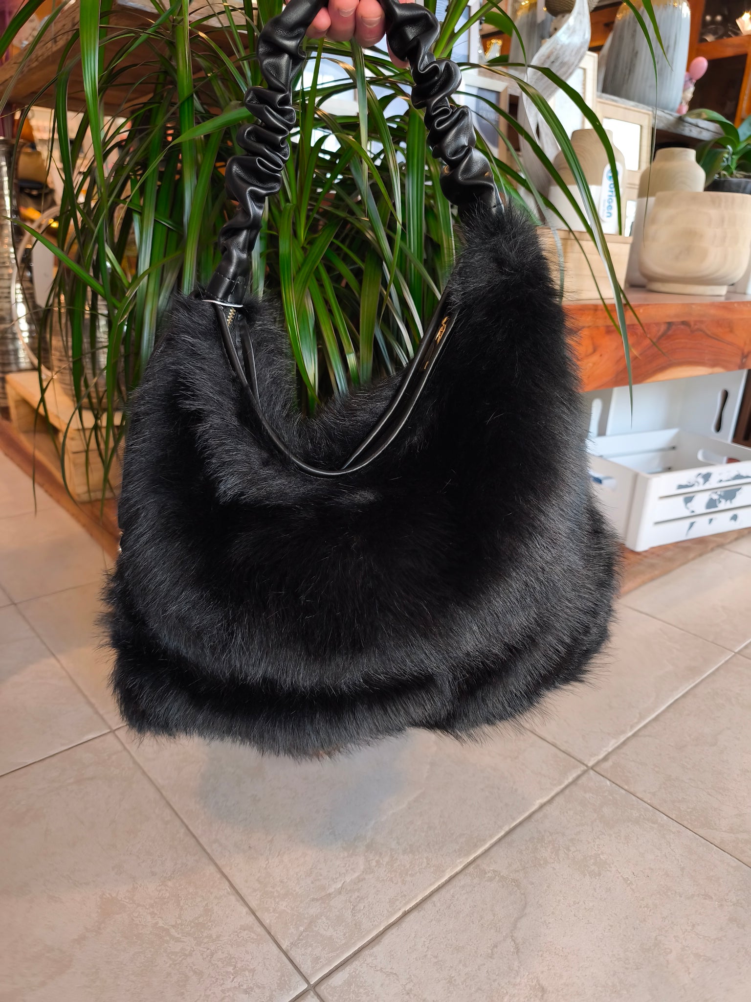 Borsa in pelliccia ecologica con un manico e tracolla in ecopelle, la chiusura è  con cerniera, all'interno è dotata di due tasche