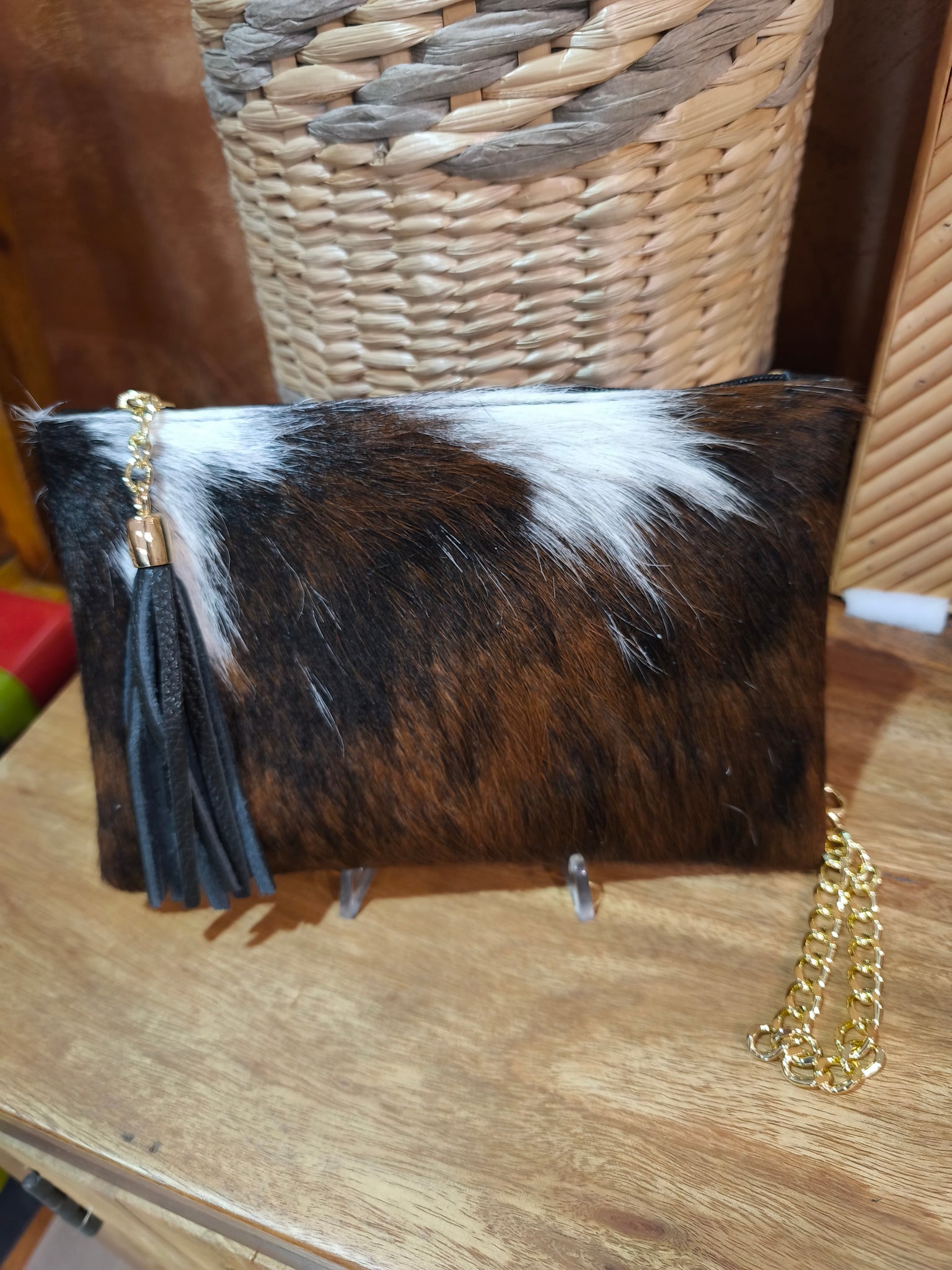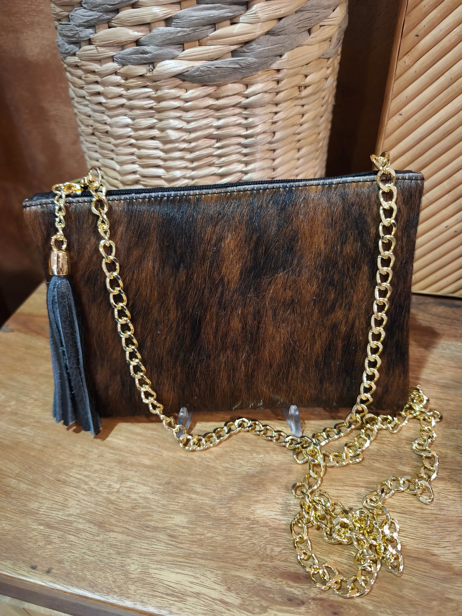Borsa modello a bustina in vera pelle e cavallino, con tracolla in catena dorata, chiusura a zip con nappina, tasca interna. Prodotto in Italia