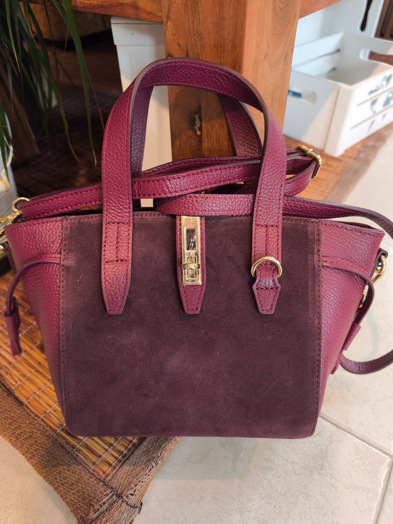 Borsa in vera pelle e camoscio con tracolla e due manici, all'interno ha due tasche, la chiusura è con cerniera.