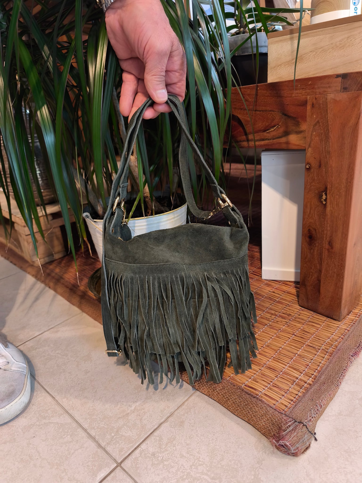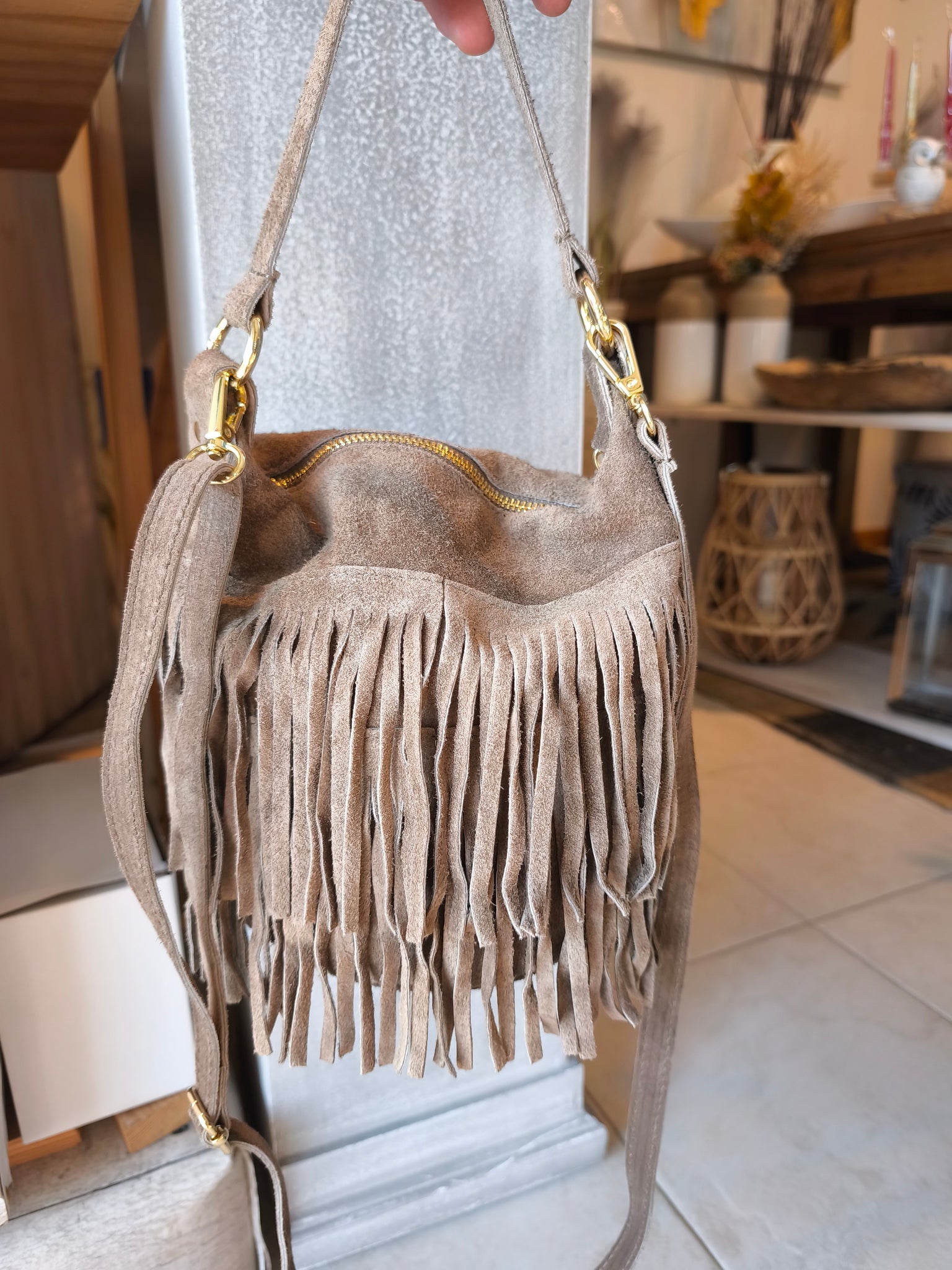 Borsa tonda in camoscio con frange, all'interno è foderata ed ha una tasca con zip punto a un manico più tracolla regolabile. La chiusura della borsa è con cerniera.