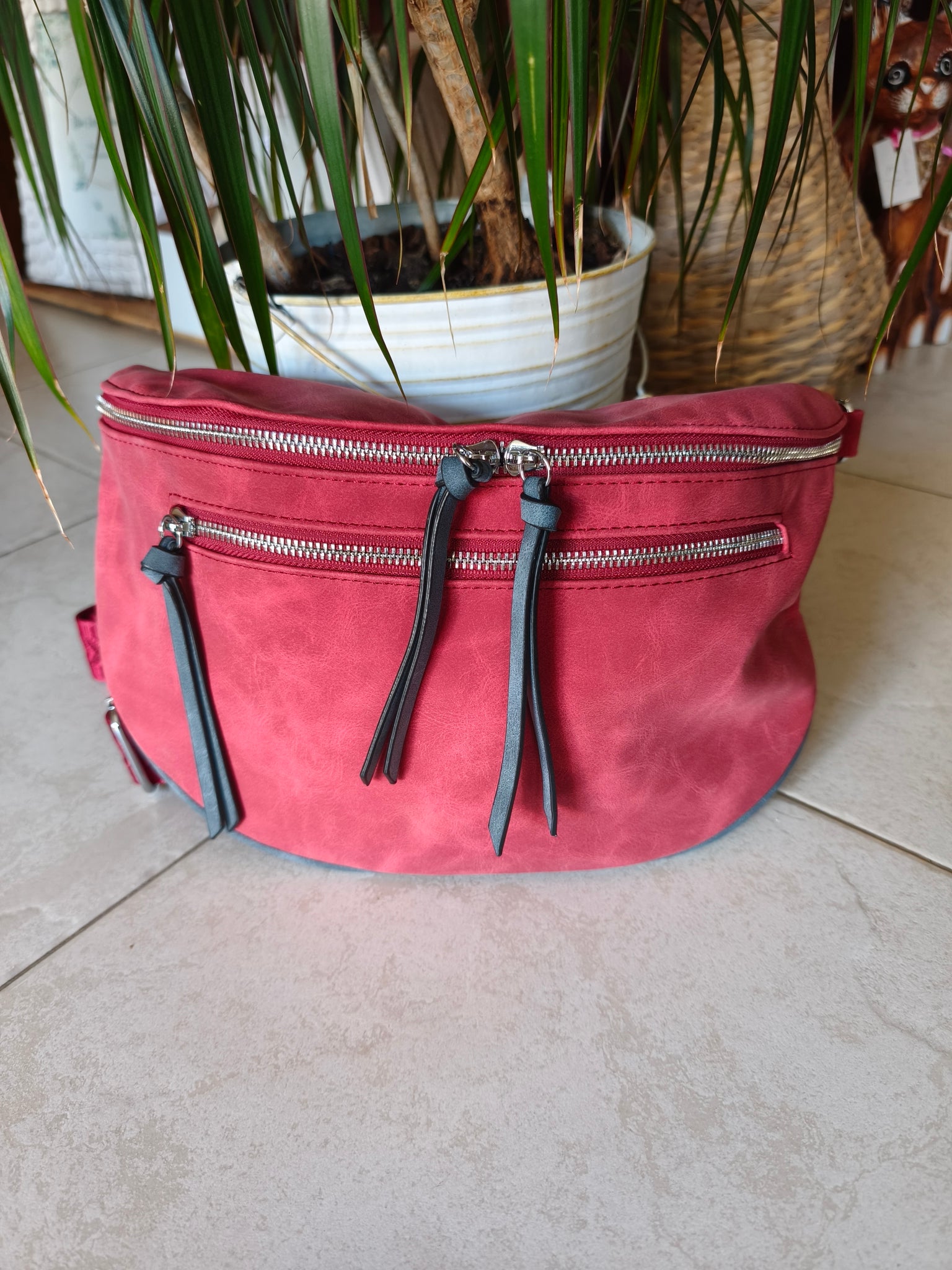 Marsupio in ecopelle effetto camoscio con 2 tasche esterne più una tasca interna, dotato di tracolla.