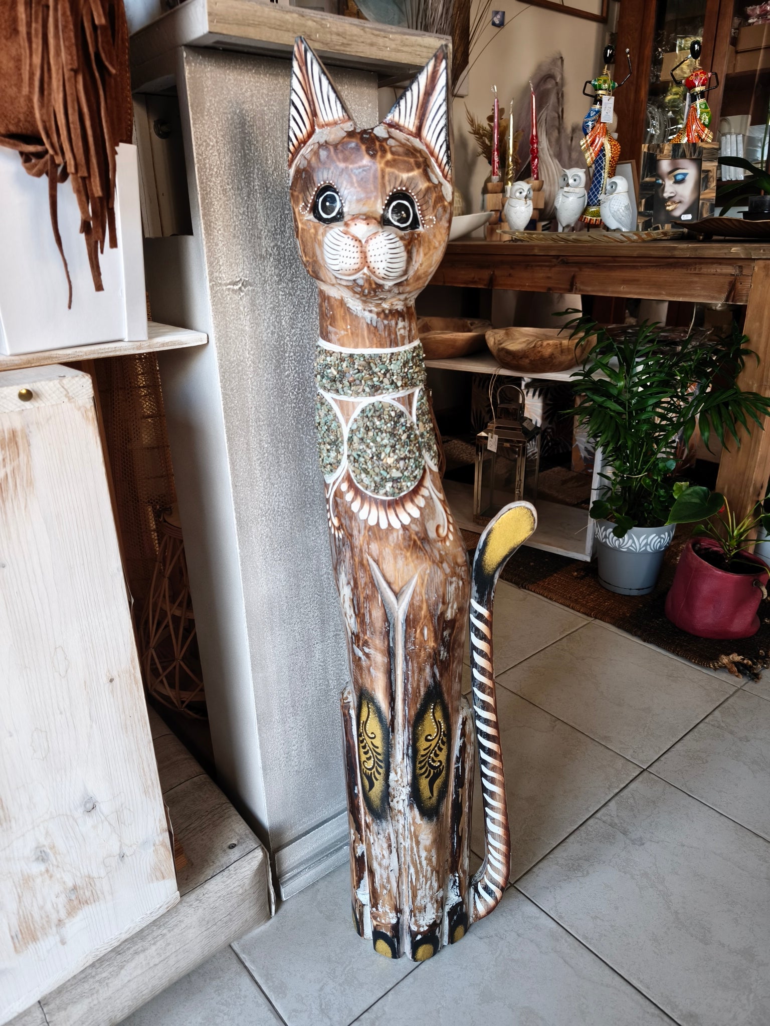 Gattone in legno fatto da artigiani indonesiani, alcuni arricchiti da parti con sabbia oppure sassolini o cochigliette.