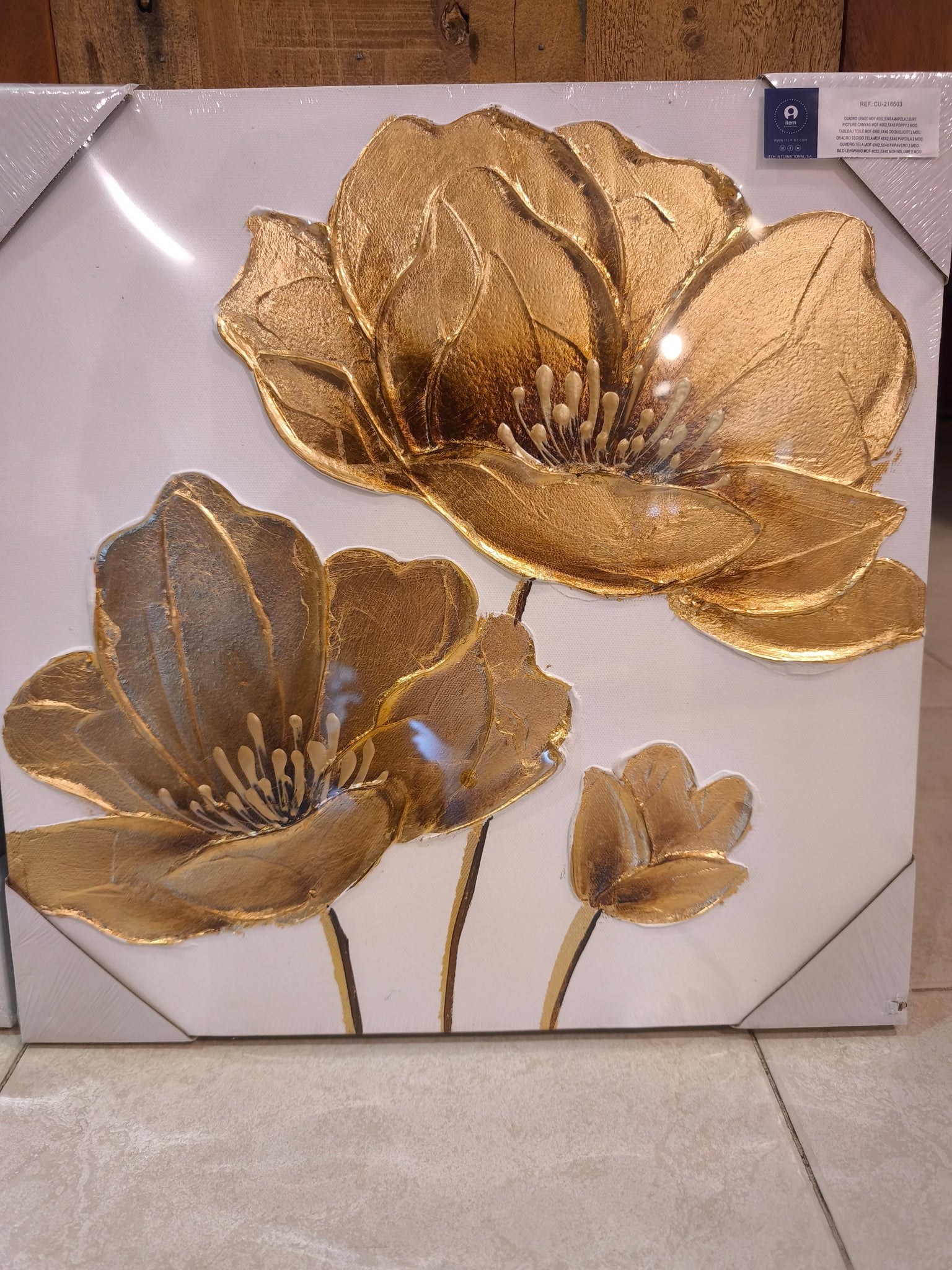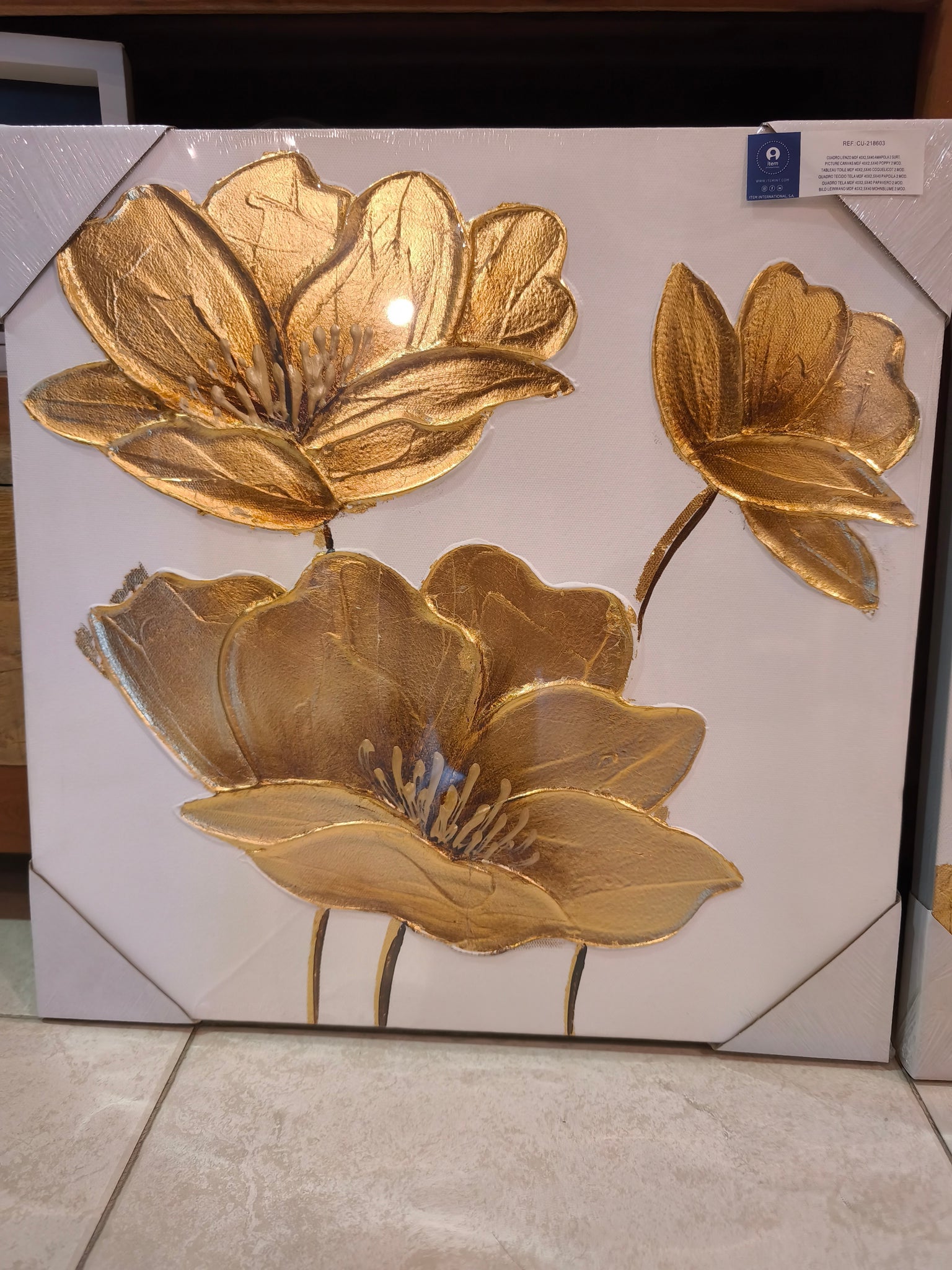 Tela con fiori oro su fondo bianco dipinta a mano.
