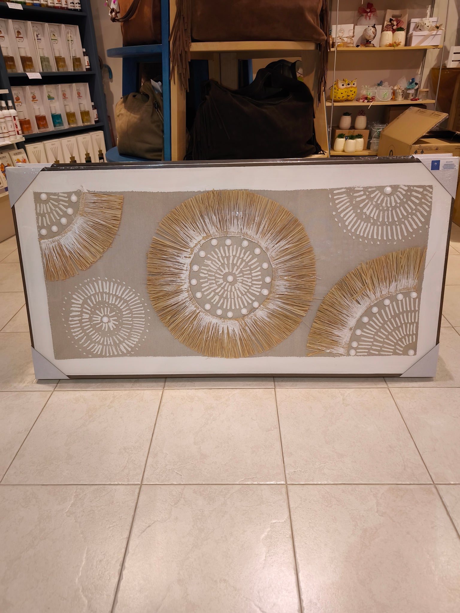 Tela dipinta a mano, con applicazioni in rafia dei toni naturali grigio beige e bianco.