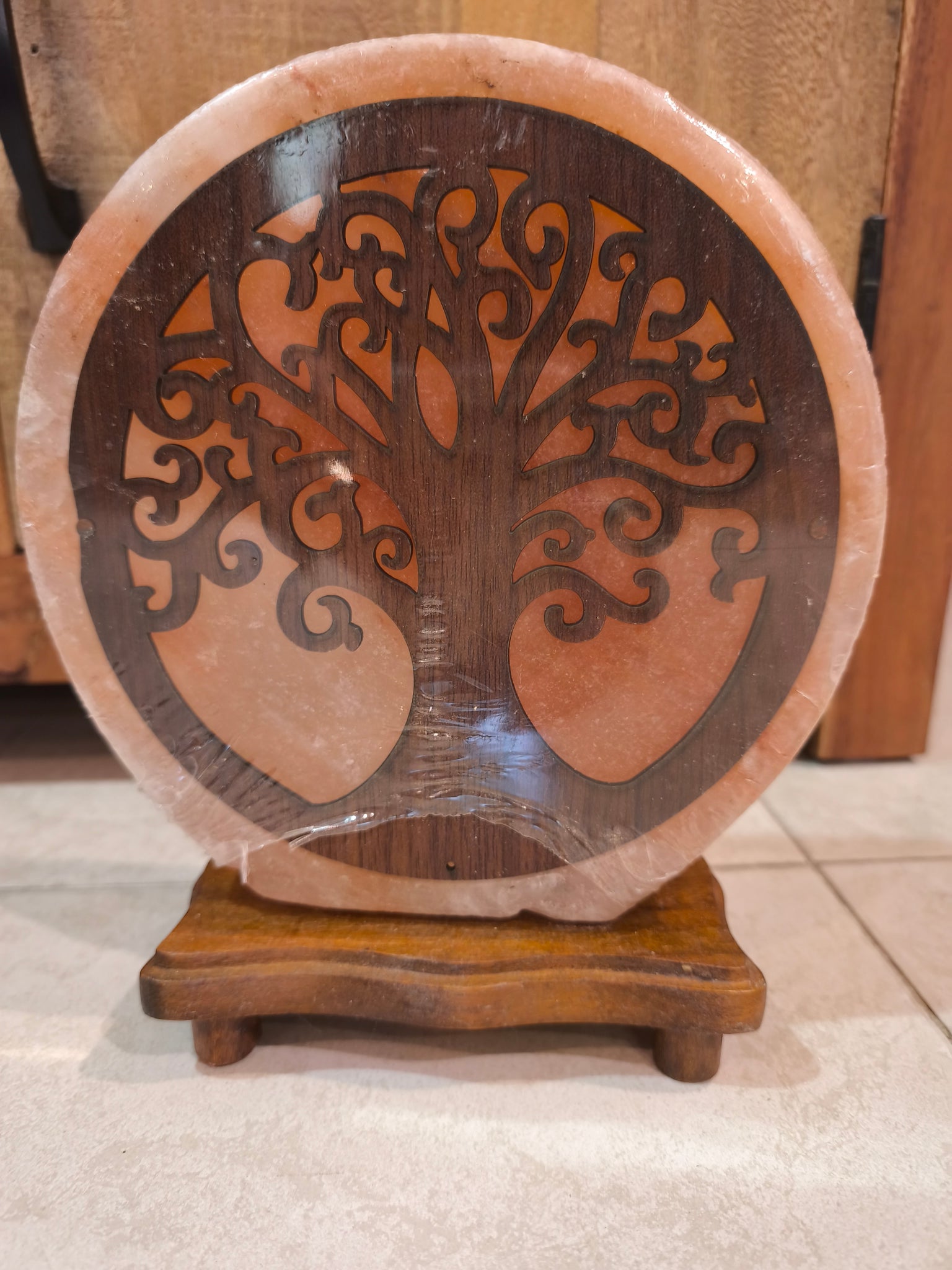 Lampada di sale tonda con base in legno e applicazione con albero della vita o gattini in legno.